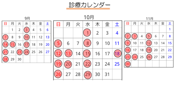 ■2025年10月診療カレンダーを更新しました。 ※10/18、10/20は研修のため休診とさせていただきます。10/14,10/21は混雑が予想されますので早めのご連絡、ご予約をお願いいたします。