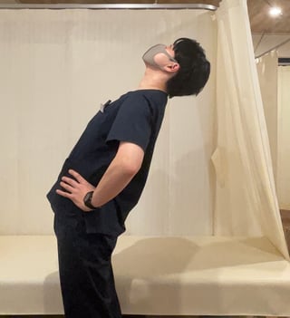 •事前確認:立って腰を反らし、痛みが出ない範囲で止めましょう。そのときの反らせる角度を覚えておきます。