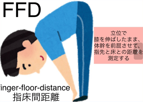 次に、ハムストリングスの柔軟性を確認してみましょう。膝を伸ばしたまま前屈し、指先が床からどれくらい離れているかを見ます。