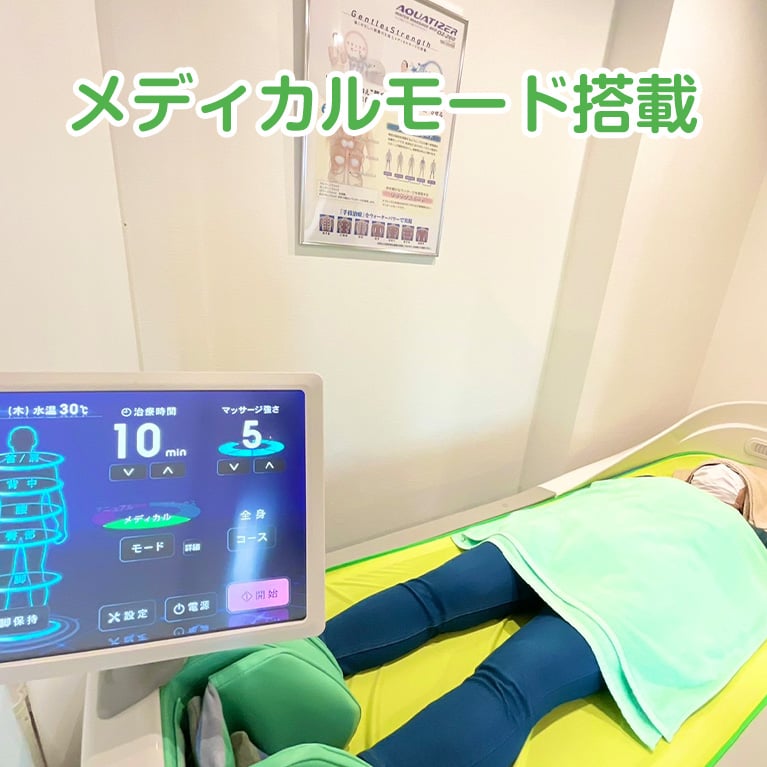 最新型ウォーターベッドはメディカルモード搭載であらゆる方向から水圧により心地よく筋肉をほぐして柔軟性も向上させることができます。また、手技療法と組み合わせて行なうことで痛みや不調を改善します。